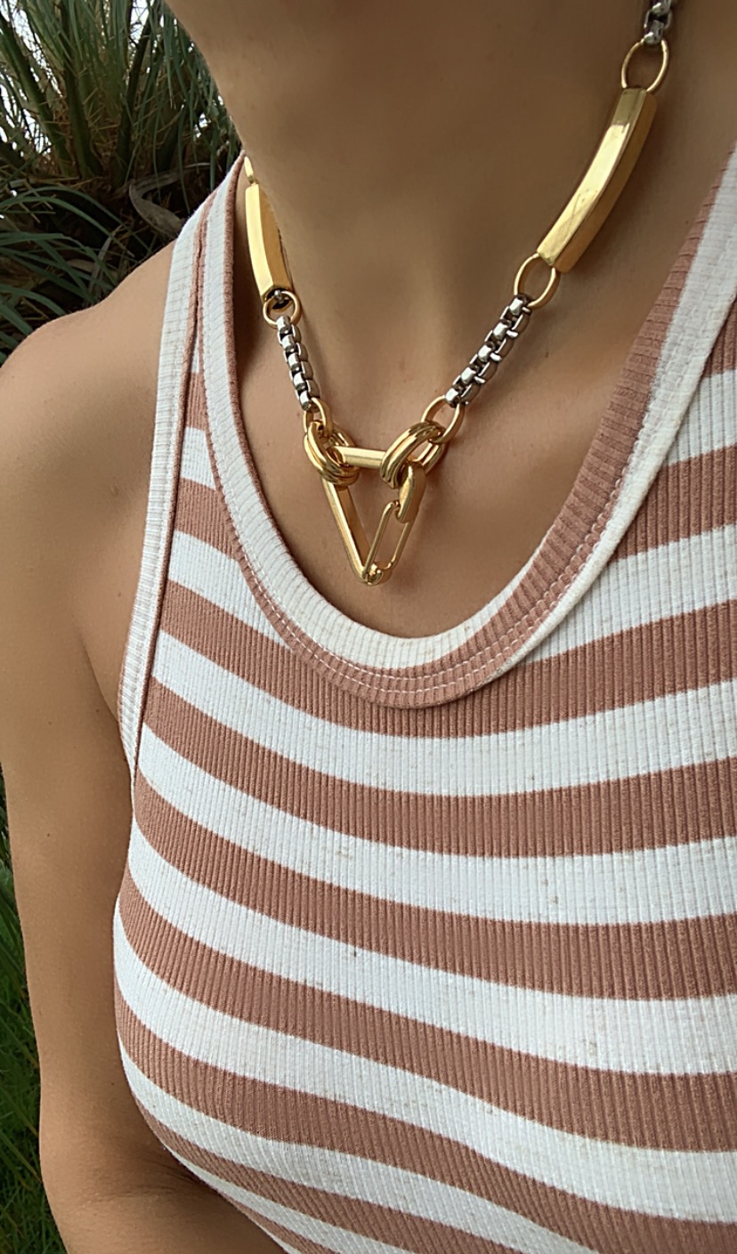 1- Colar curto mix de banhos ouro e ródio, verniz italiano de proteção, corrente veneziana e fecho mosquetão super prático em formato de triângulo. Um acessório cheio de estilo e personalidade que faz a diferença no seu look