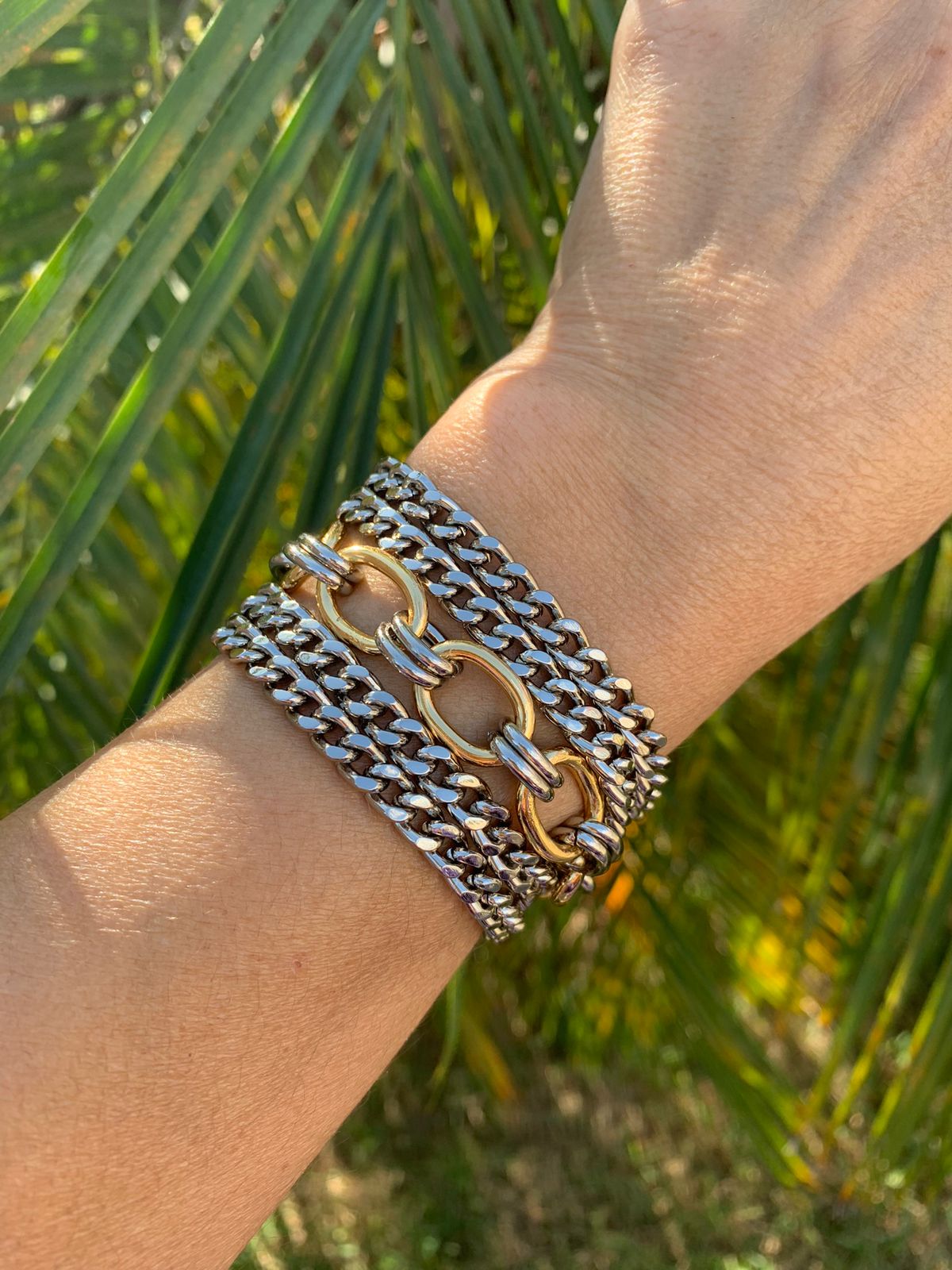 Maxi pulseira cheia de estilo produzida em correntaria com mix de banhos ouro prata e verniz italiano, além da praticidade de um potente fecho imã. É um acessório versátil e cheio de personalidade que dá a liberdade de usar com outros acessórios de banho ouro ou prata